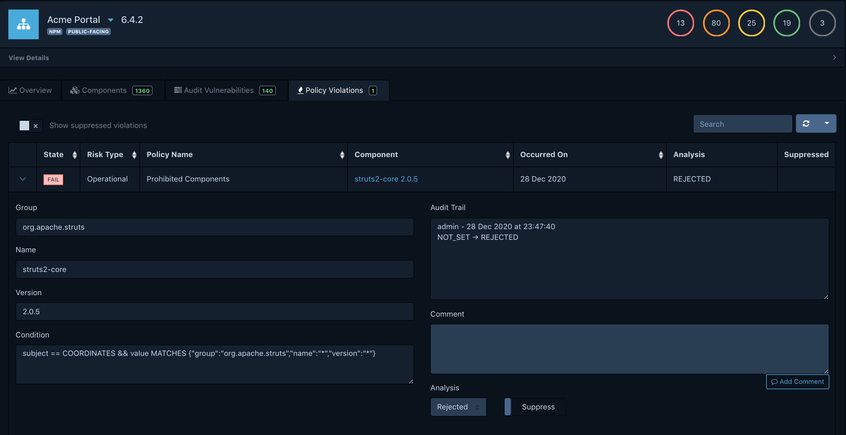 Security, operational, and license policies ensure that associated risk is quickly identified across development teams, suppliers, and partners in the supply chain